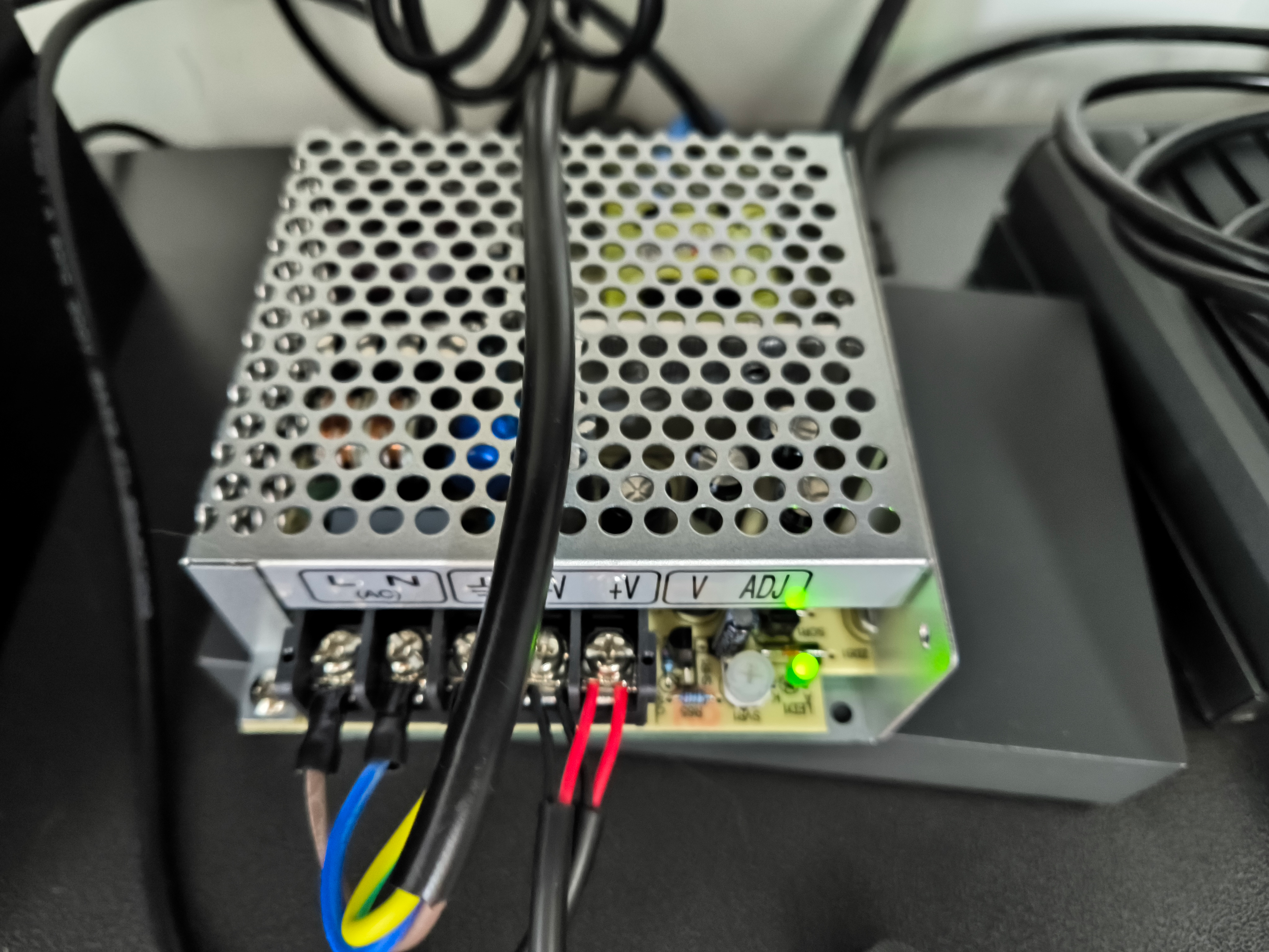 这是一个明纬的开关电源。由于这里的设备太多,但是不少都是 12V DC 供电,因此用这样一个开关电源来集中供电能省下不少空间和插座。